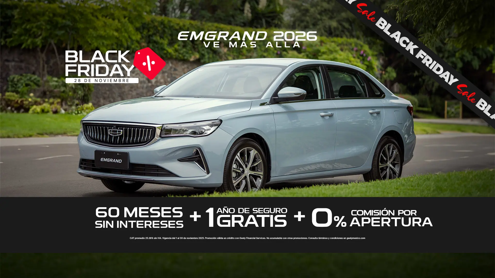 "El año de seguro gratis” aplica para el modelo Emgrand 2026 en su versión GF en operaciones de crédito a través de Geely Financial Services. Únicamente con aseguradoras participantes, consulta especificaciones con tu Distribuidor autorizado Geely. Al finalizar el periodo del seguro gratis el cliente deberá contratar un seguro conforme a lo señalado en su contrato de crédito. Aplica 2.5% de comisión por apertura en plan BASE o 0% Comision por apertura utilizando el plan BUEN FIN.